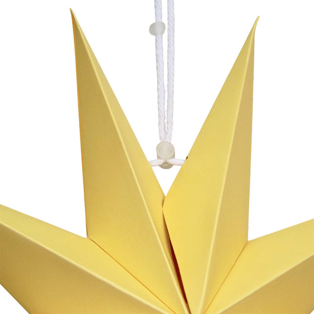 Объёмная декоративная звезда из картона диаметром 30 см с 9 лучами. Оснащена встроенным шнурком для подвешивания. Поставляется в компактном сложенном виде и быстро собирается: специальный шнурок при затягивании придаёт изделию объём и фиксирует форму. После сборки звезда остаётся устойчивой без дополнительных креплений и может использоваться многократно.